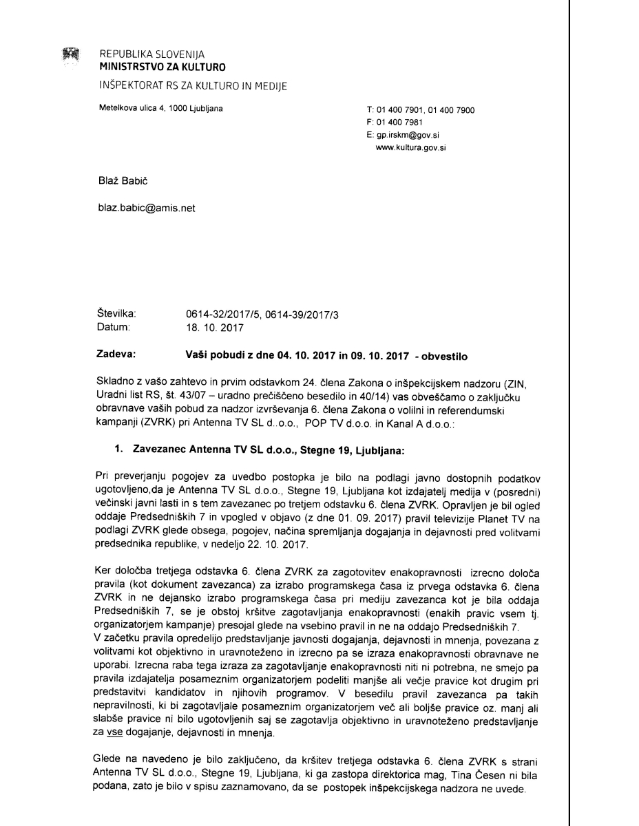 1. Dne 4.10.2017 sem zaradi grobega cenzuriranja dveh od devetih kandidatov Inšpektoratu za kulturo in medije prijavil Planet TV, točneje Antenna TV SL, d.o.o.