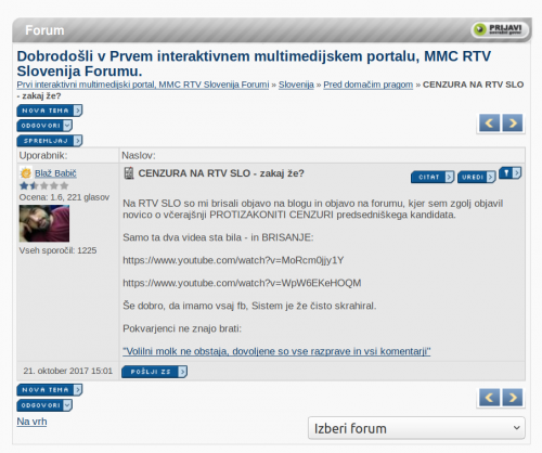 Na RTV SLO so mi brisali objavo na blogu in objavo na forumu, kjer sem zgolj objavil novico o včerajšnji PROTIZAKONITI CENZURI predsedniškega kandidata.