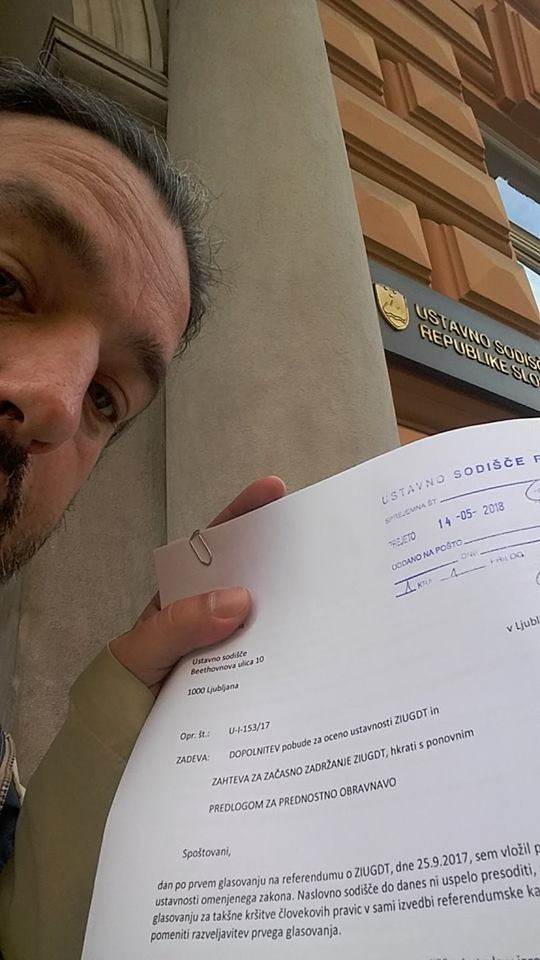 dan po prvem glasovanju na referendumu o ZIUGDT, dne 25.9.2017, sem vložil pobudo za oceno ustavnosti omenjenega zakona. Naslovno sodišče do danes ni uspelo presoditi, ali je šlo (že) pri prvem glasovanju za takšne kršitve človekovih pravic v sami izvedbi referendumske kampanje, ki bi morale pomeniti razveljavitev prvega glasovanja.