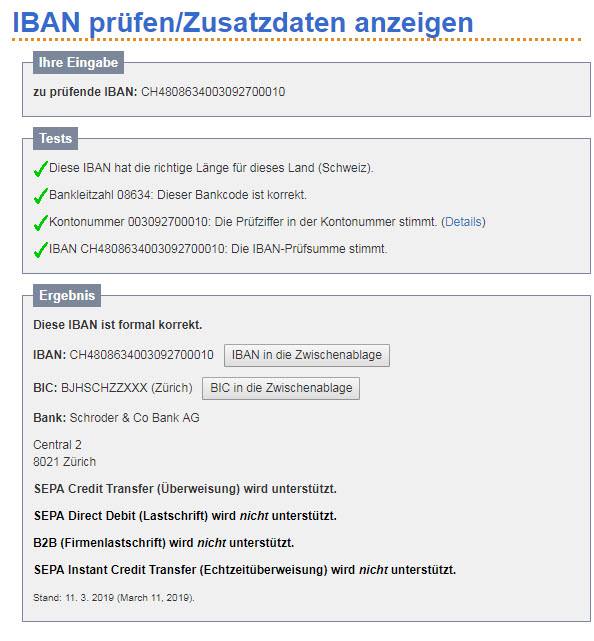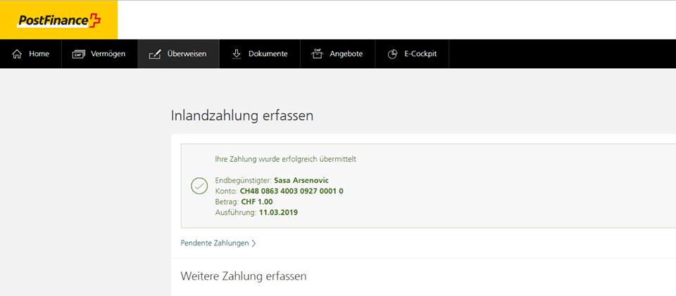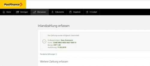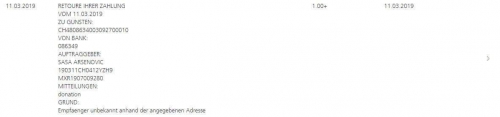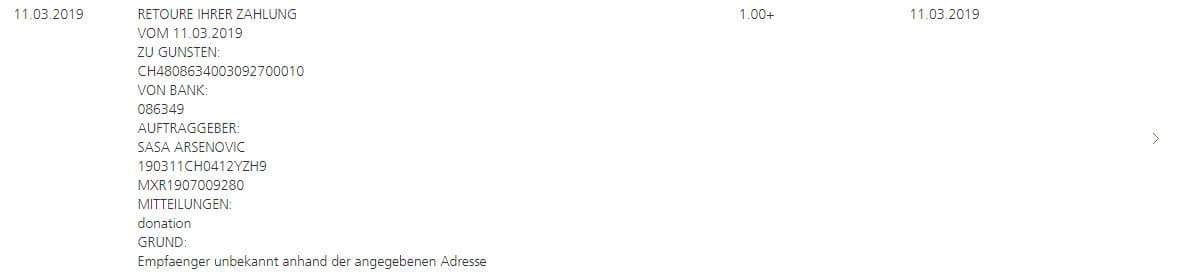 No, v ponedeljek, 11.3.2019 so se razmere v švicarskem bančnem sistemu le nekoliko spremenile - enako nakazilo, kot v nedeljo, sedaj ni bilo več mogoče. Pojavilo se je namreč obvestilo o tem, da takega računa več ni.