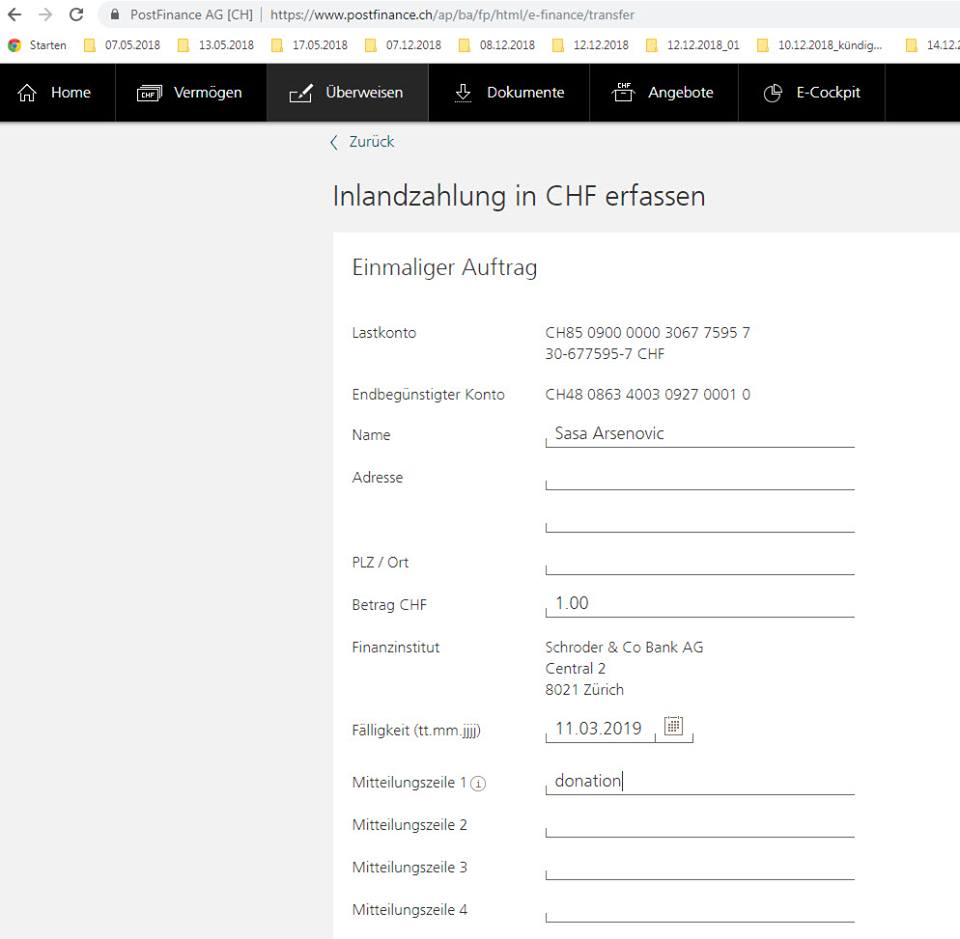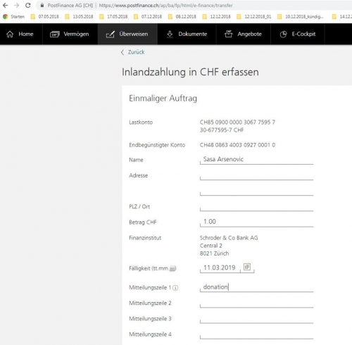 Njegovo nakazilo, donacija v višini 1 švicarskega franka (CHF) je šla gladko skozi.