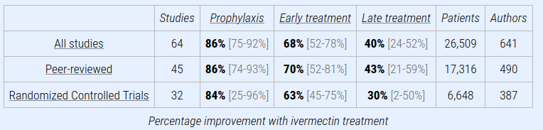 Metaanalize, ki temeljijo na 18 naključnih nadzorovanih študijah zdravljenja z ivermektinom pri COVID-19, so pokazale veliko, statistično pomembno zmanjšanje umrljivosti, časa do kliničnega okrevanja in časa do odstranitve virusa. Poleg tega rezultati številnih nadzorovanih preskušanj profilakse poročajo o znatno zmanjšanem tveganju za okužbo s COVID-19 ob redni uporabi ivermektina. Številni primeri kampanj razdeljevanja ivermektina, ki so privedle do hitrega zmanjšanja obolevnosti in umrljivosti v celotni populaciji, kažejo, da je bilo opredeljeno peroralno sredstvo, ki je učinkovito v vseh fazah COVID-19.
