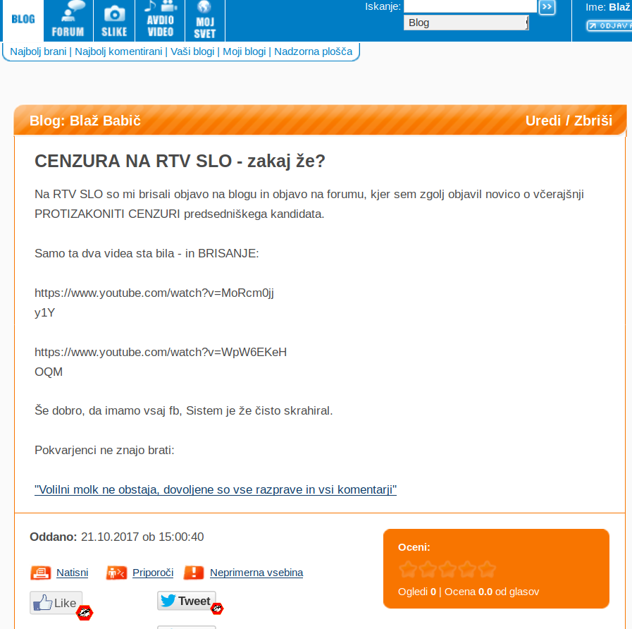 Na RTV SLO so mi brisali objavo na blogu in objavo na forumu, kjer sem zgolj objavil novico o včerajšnji PROTIZAKONITI CENZURI predsedniškega kandidata.