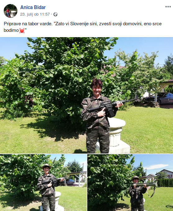 Ani(ca) Bidar je vsekakor rada v maskirni uniformi, rada pozira s kopijami vojaškega orožja in je sopredsednica stranke. Skupaj z Mihcem in sinčkom so bili vsi skupaj na usposabljanju 2. generacije Varde. Oba sopredsednika stranke ZSi torej sta že zraven, potem so pa še številni drugi ZSi-jevci, ampak najbolj važno je pa to, da ima DELO zapolnjen prostor.